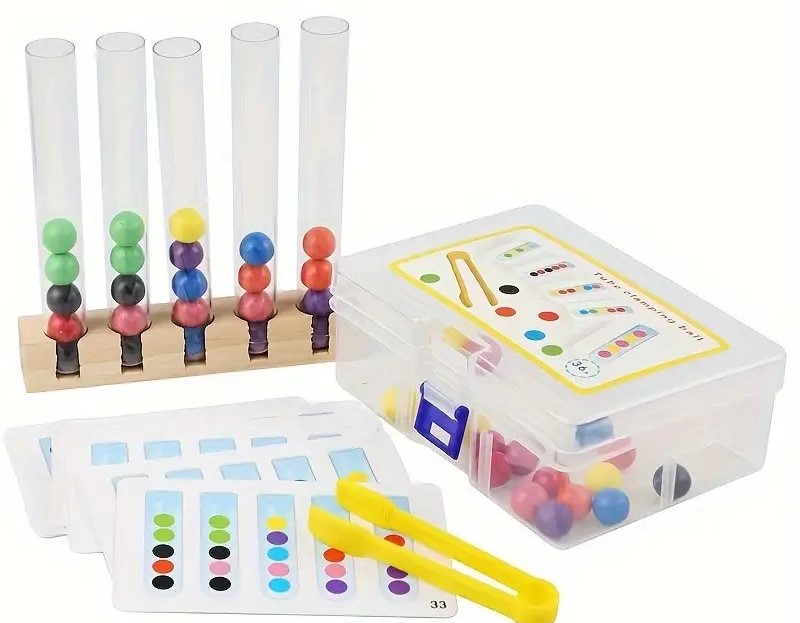 z.Zt. nicht lieferbar. Holzperlen Sortierspiel. 5 Reagenzröhrchen Ständer Greifzange Holzperlen und Vorgabekarten und Aufbewahrungsbox. STEM Bildungs- und Kognitionsspiel Holzfarbenspiel, für die Entwicklung von kognitiven Fähigkeiten. Pädagogisches Farb- und Sortierpuzzle, Fördert die Feinmotorik, Lernspielzeug Kinder ab 3Jahren